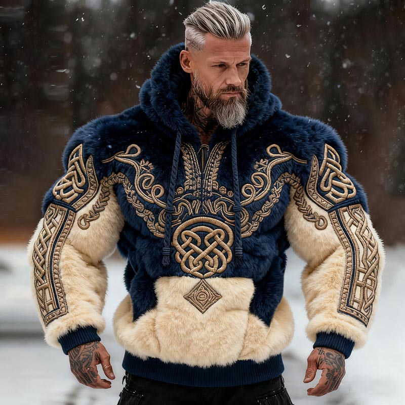 Men's Viking Tribal Jacquard Muscle Line Inspired Art Plush Warm Hoodie