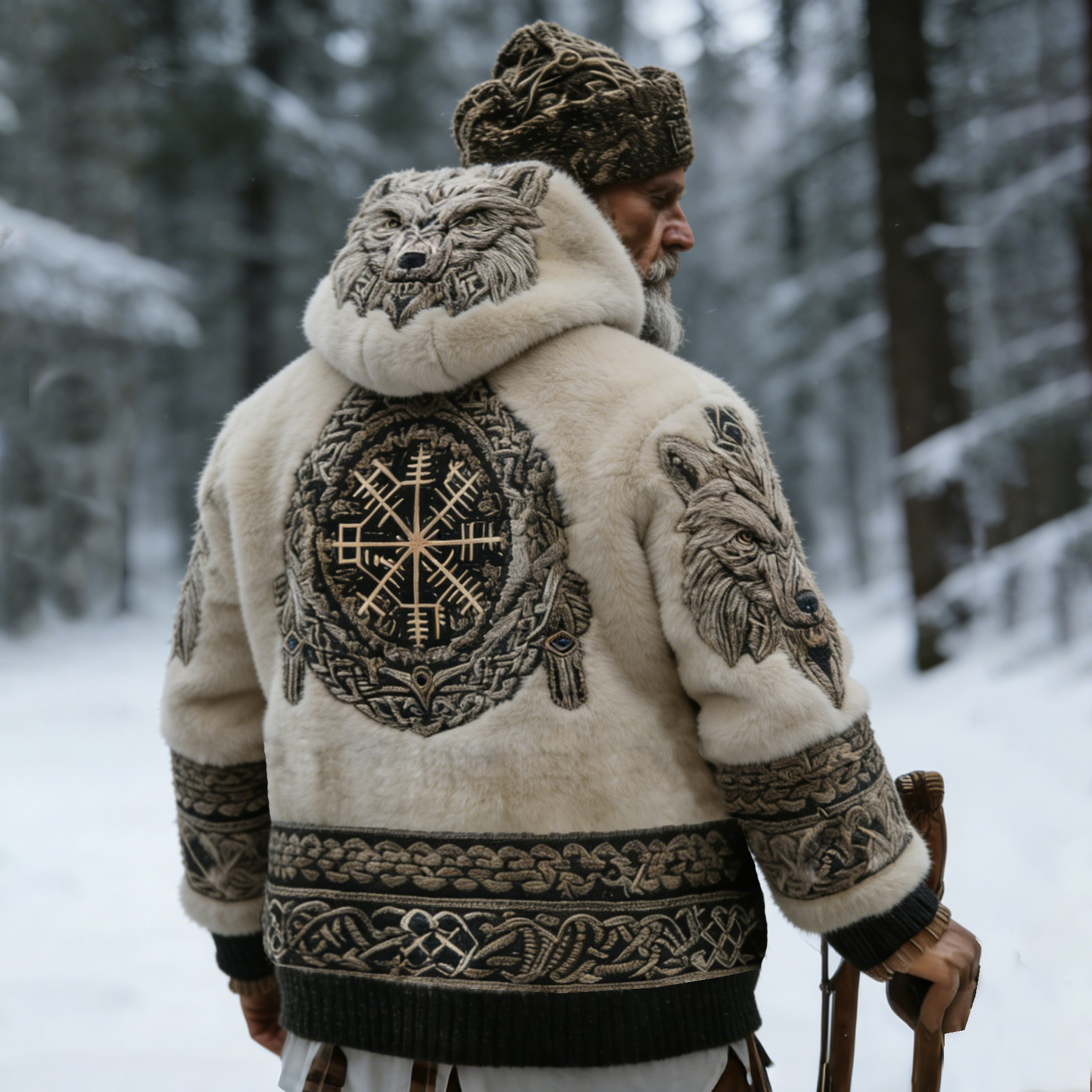 Men's Viking Vegvisir With Wolf Art Flannel Zipper Hoodie