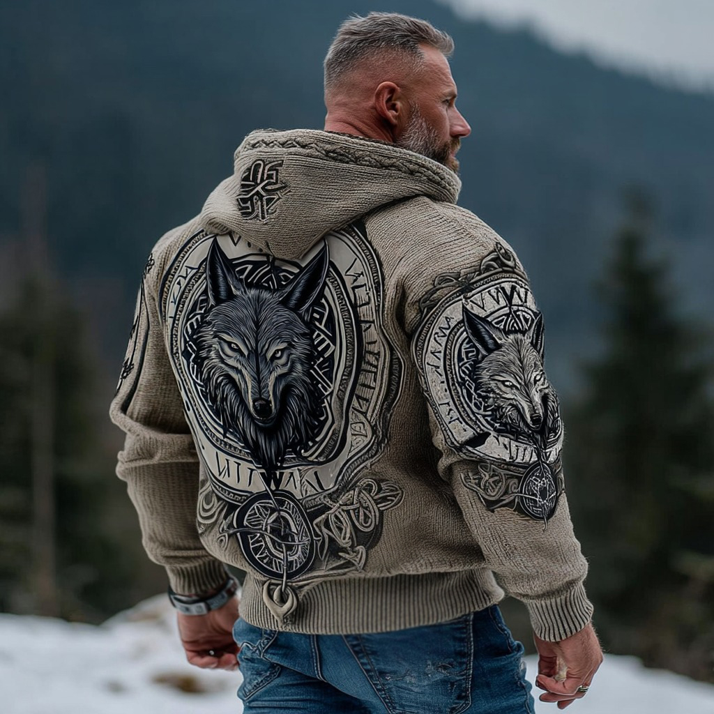 Men's Vintage Viking Vegvisir Wolf Art Knit Zip Up Hoodie