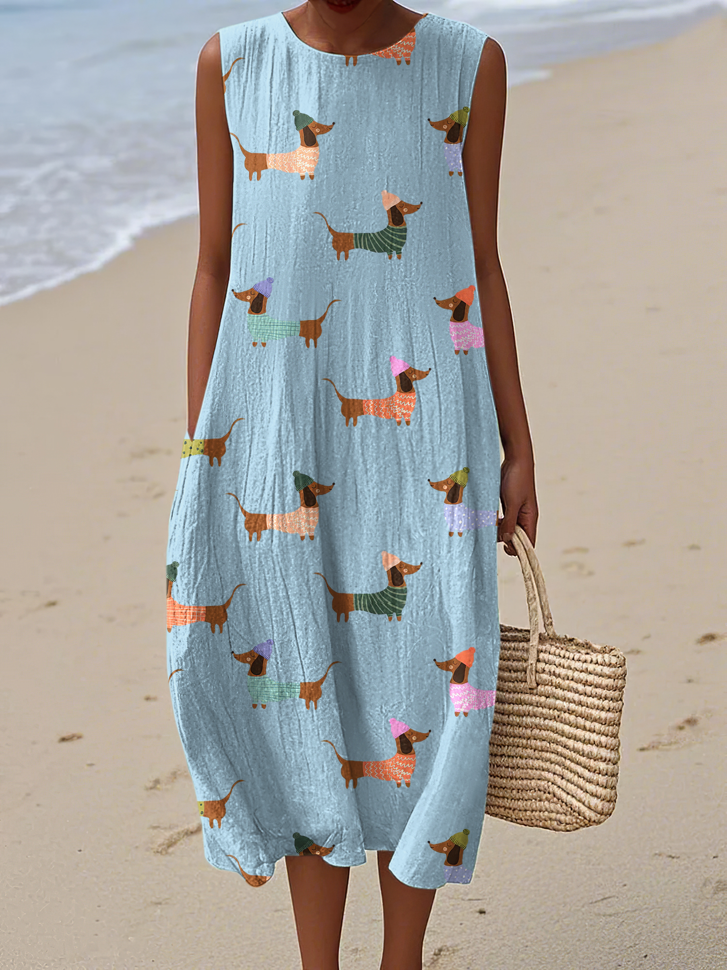 Retro Cute Dachshund Dog Art Linen Tank Midi Dress