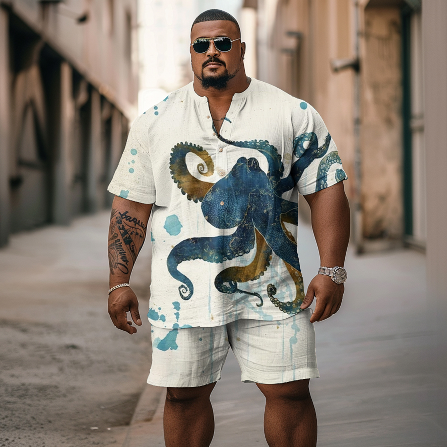 Men'S Plus Size Japanese Octopus Ink Painting Art Graphic Casual Linen Henry Collar Shirt Set