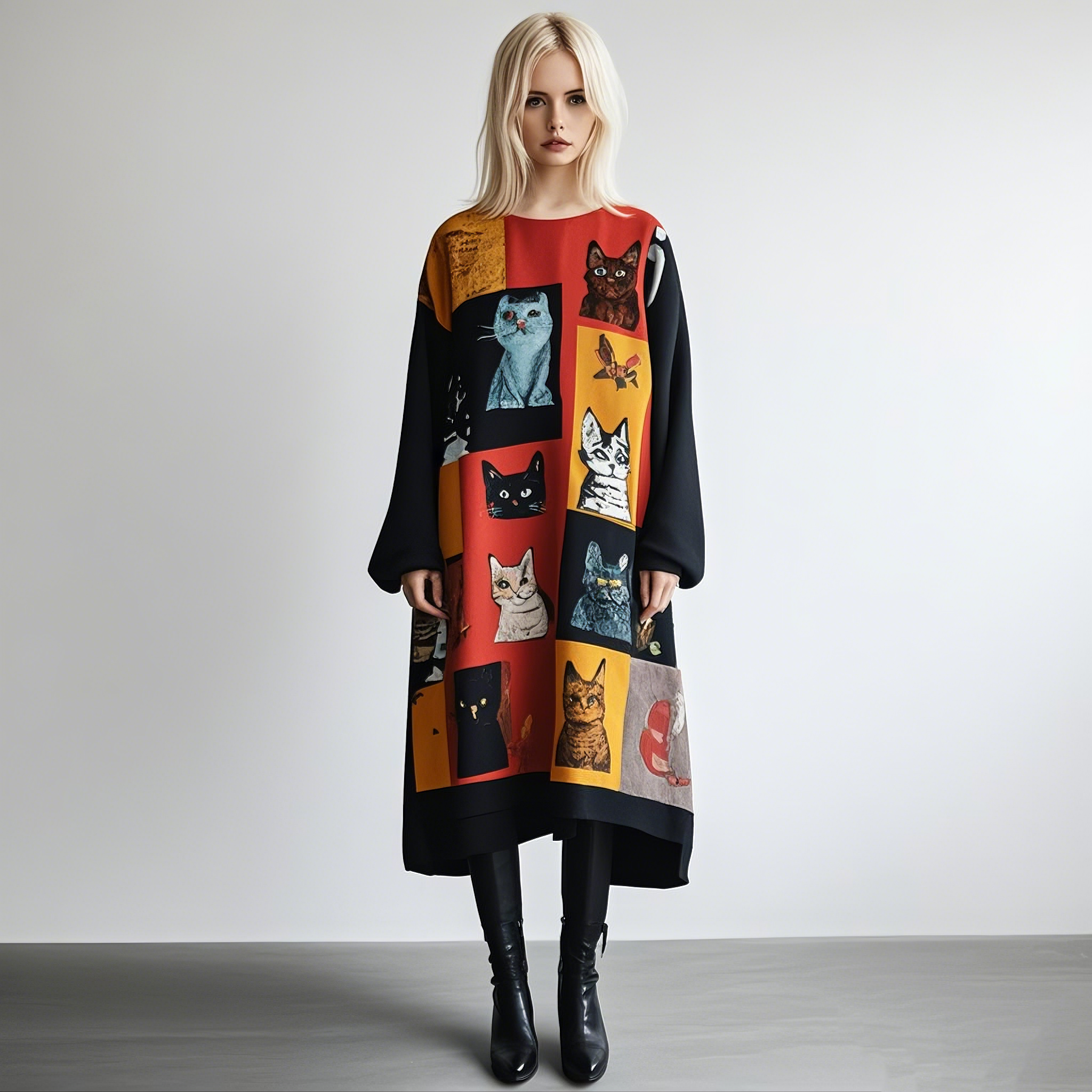 Pop Art Cat Patchwork Pattern Design Long Sleeves Midi Dress