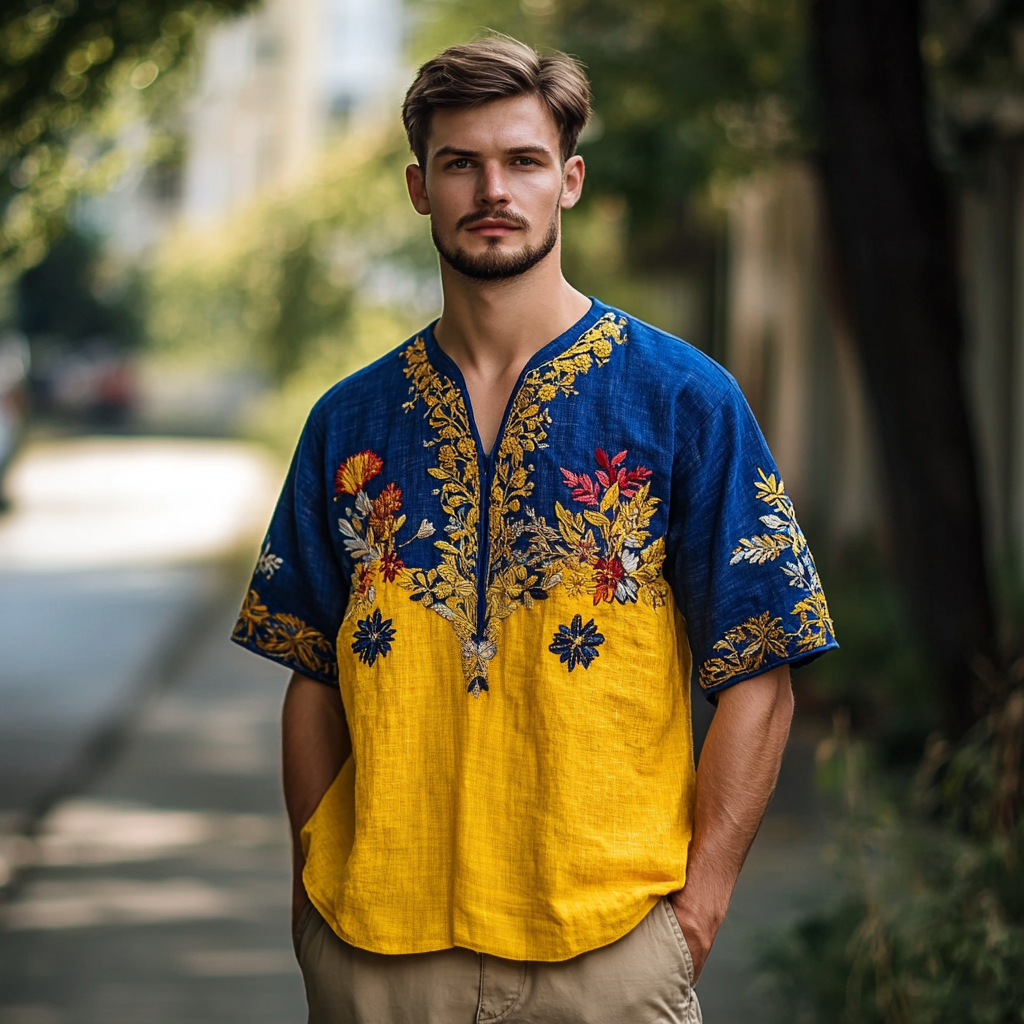 Men's Ethnic Floral Cotton And Linen V-neck Short-sleeved Shirt