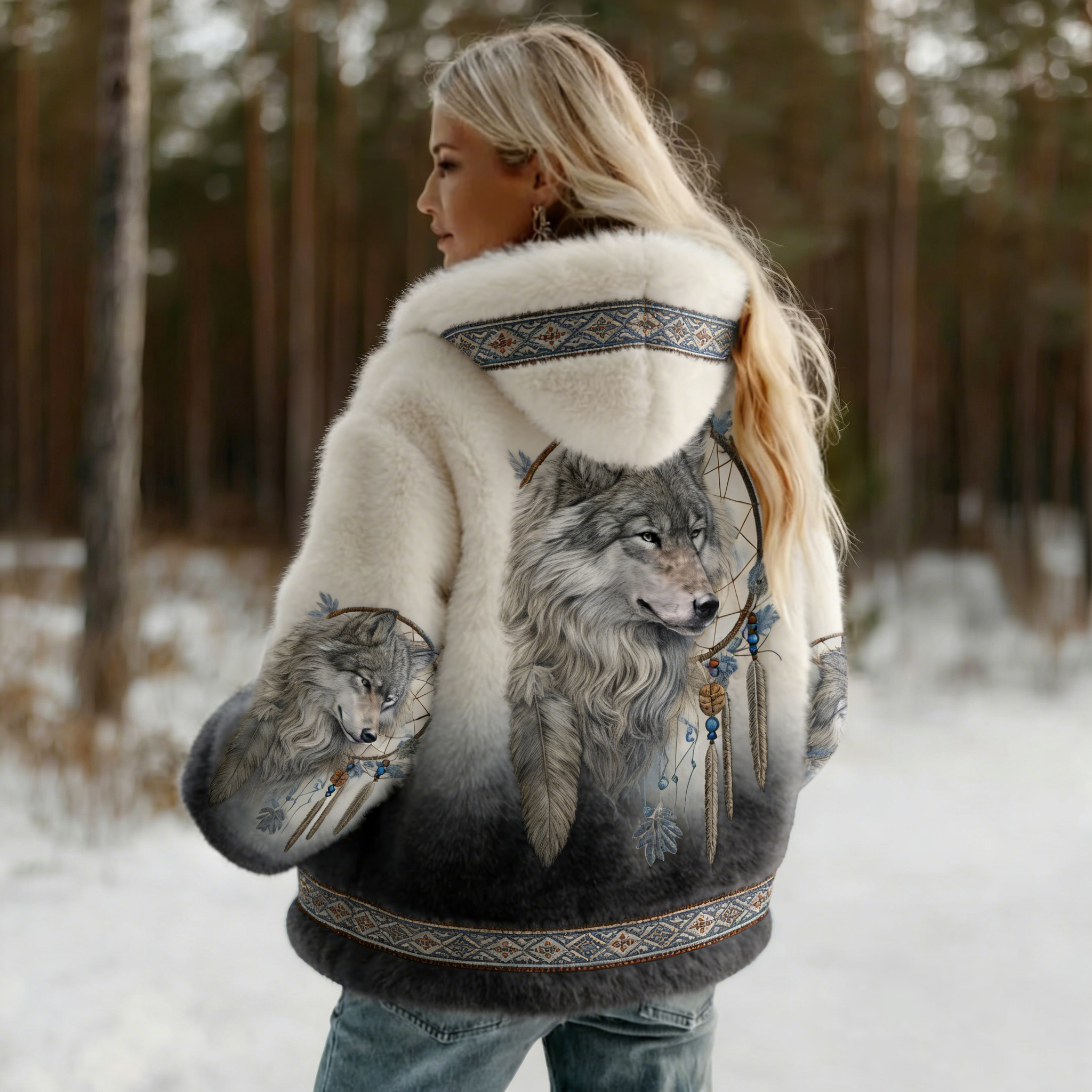 Women's Vintage Wolf Art Knit Cozy Flannel Hoodie