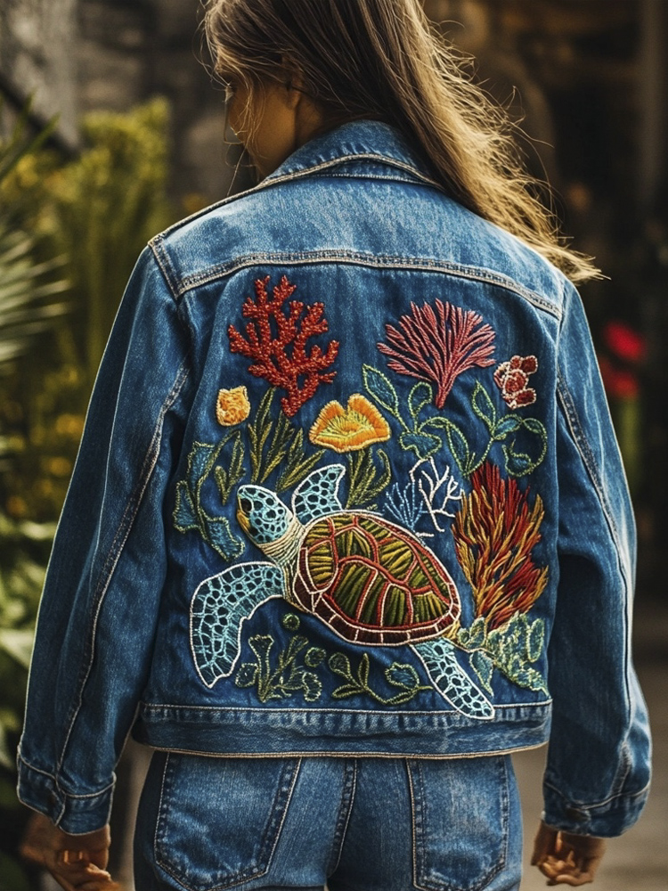 Ocean Coral & Turtle Embroidered Women's Denim Jacket