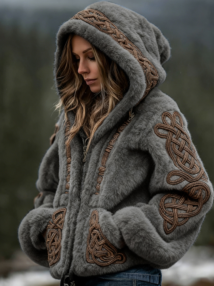 Women's Viking Celtic Art Cozy Warm Flannel Hooded Jacket
