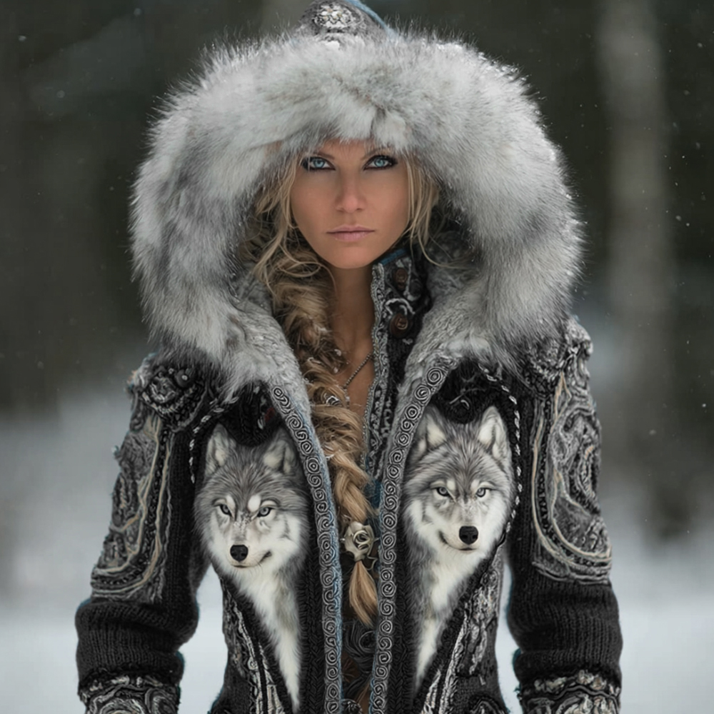 Women's Viking Style Three-dimensional Embroidered Wolf Retro Hooded Sweater