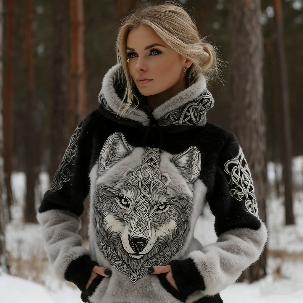 Women's Retro Viking Wolf Art Plush Hooded Sweatshirt